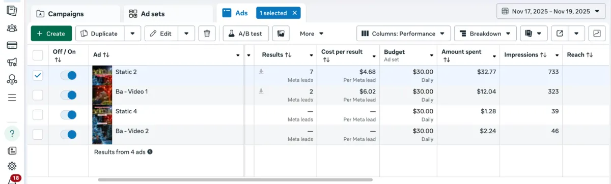 2 days into the campaign and leads are coming in as low as $4.68, a clear winner among the creatives is also emerging.