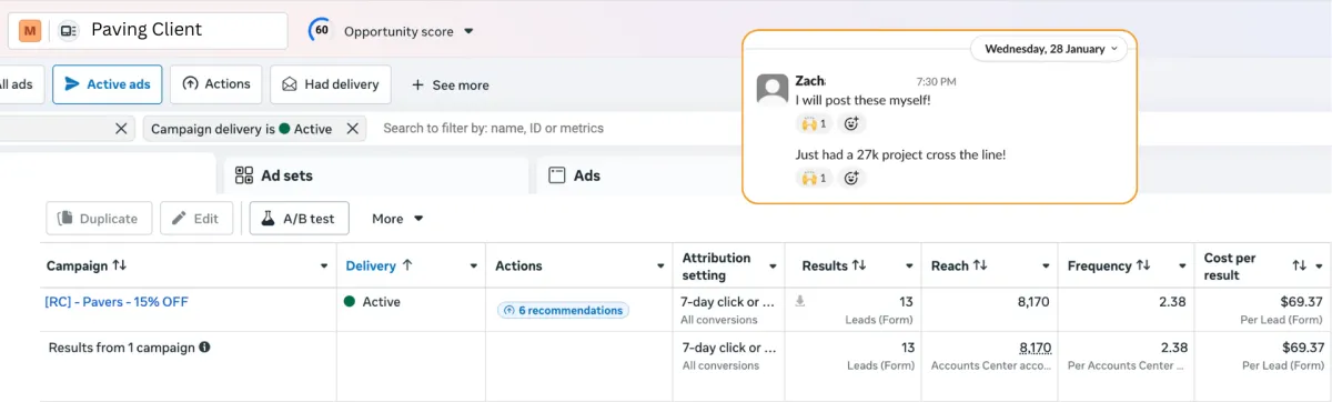 In the first 30 days of running this campaign for our paving client he received 13 leads and landed a job worth $27k and has another 3 $30k jobs ready to get over the line.