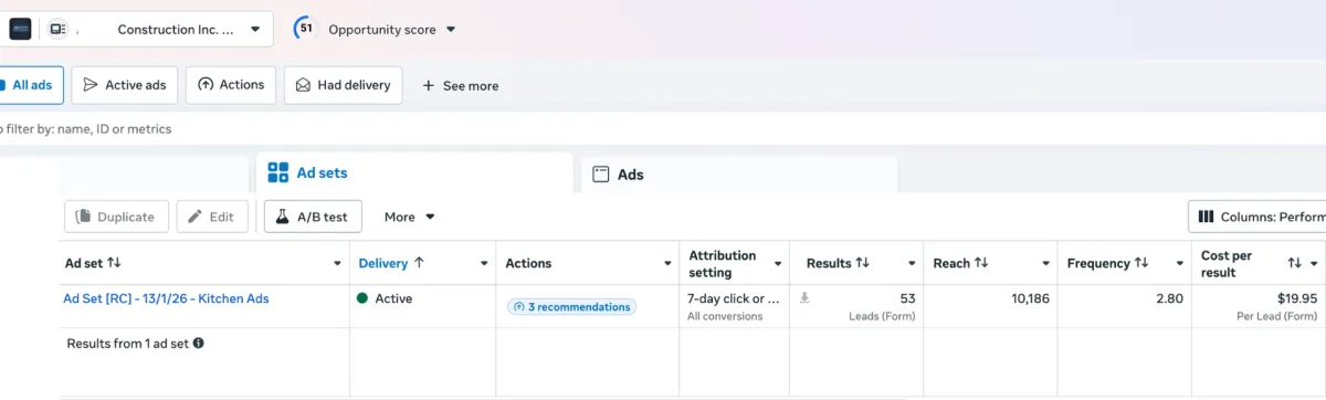 In the first 30 days of running this campaign Kitchen Renovation client he received 53 leads at a cost of $19.95 per lead