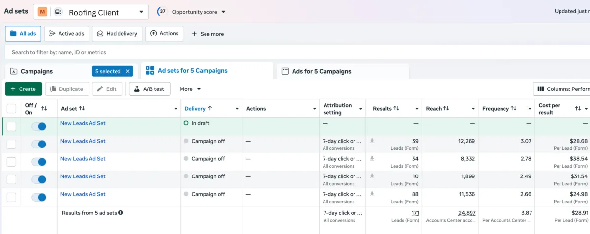 171 leads in 90 days with a cost per lead of $28.91 and 11 full roof replacements landed totalling $165k
